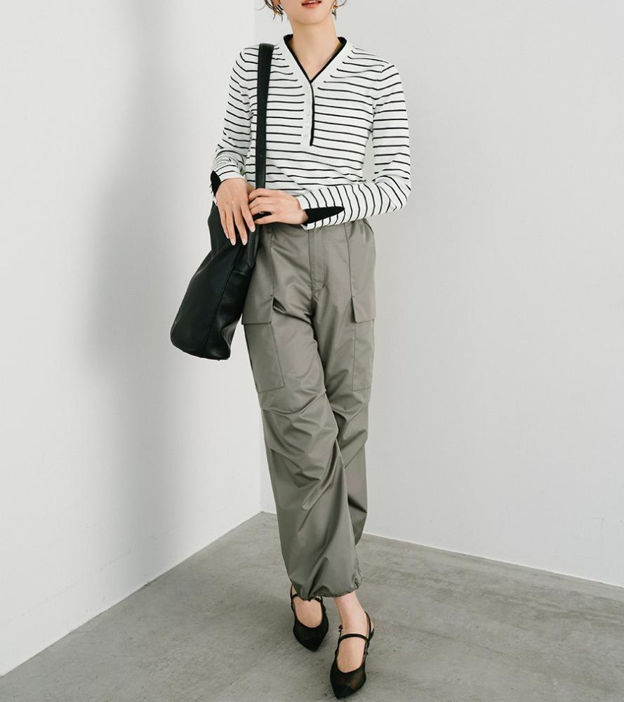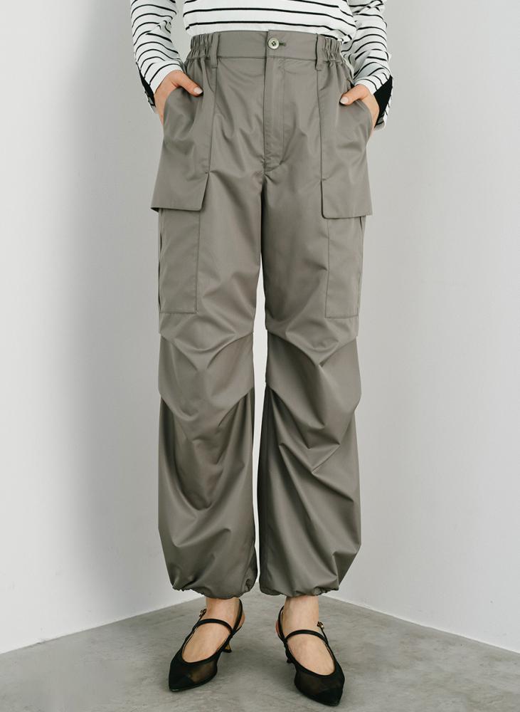 光沢感のあるきれいめな素材のカーゴパンツ。